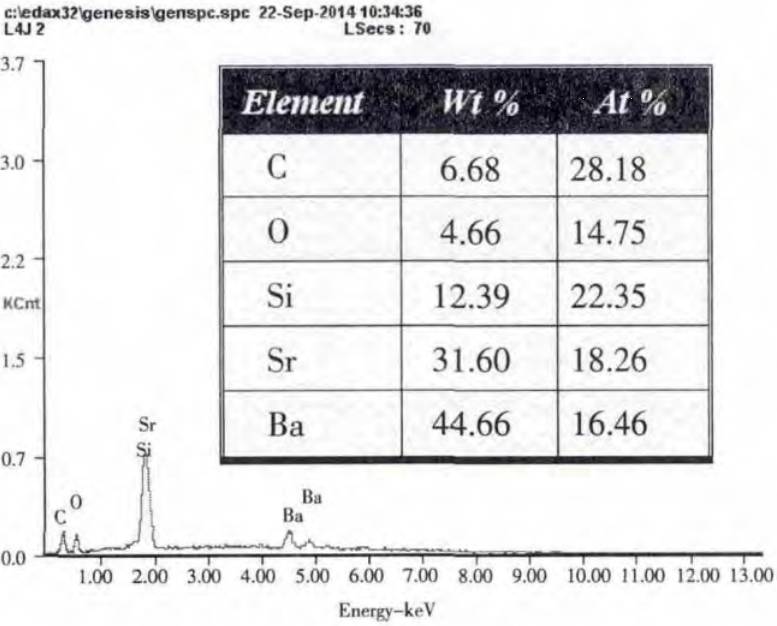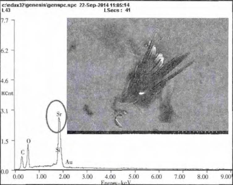 燈珠裝配成LED燈具后在倉(cāng)庫(kù)儲(chǔ)存時(shí),發(fā)生了色溫漂移失效,失效 LED 燈珠的封裝膠由橙色變?yōu)闇\黃色,對(duì)其進(jìn)行 I-V 特性測(cè)試,發(fā)現(xiàn)燈珠可以正常點(diǎn)亮,且 I-V 曲線(xiàn)正常,只是出光亮度發(fā)生改變。取一些失效燈珠,以機(jī)械開(kāi)封方式取出封裝膠,發(fā)現(xiàn)支架表面均殘留有透明顆粒物,使用 SEM&EDS 測(cè)試顆粒物成分,結(jié)果顯示其含有高含量的鍶(Sr)元素,如圖 6 所示; 而封裝膠與支架接觸面也檢出了高含量的鍶(Sr)元素和鋇(Ba)元素,如圖 7 所示。