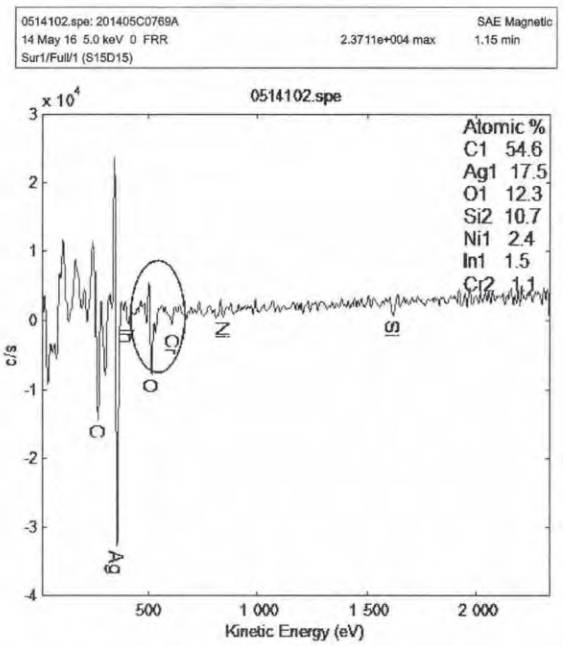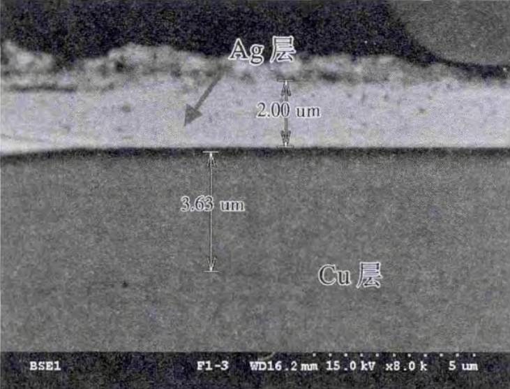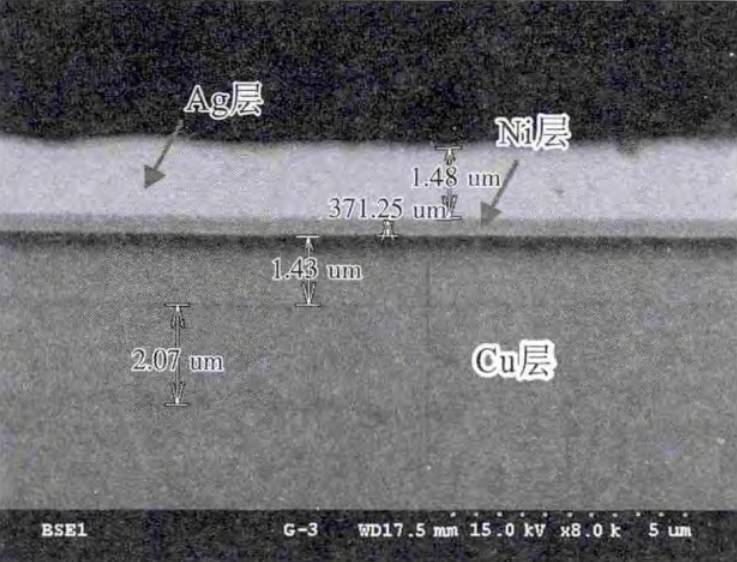 將半成品支架和失效LED燈珠制作成切片, 觀(guān)察其截面鍍層質(zhì)量,發(fā)現(xiàn)支架鍍層結(jié)構(gòu)為銅鍍鎳再鍍銀,與半成品相比,失效品支架的鎳鍍層變薄,表層銀層變得疏松,且鎳銀鍍層界限變得模糊, 樣品的支架截面形貌如圖 10 所示。使用 AES 測(cè)試失效 LED 支架淺表層成分,發(fā)現(xiàn)其中會(huì)有鎳(Ni)元素, 測(cè)試結(jié)果如圖 11b 所示,很顯然,鎳鍍層擴(kuò)散至了銀層表面。