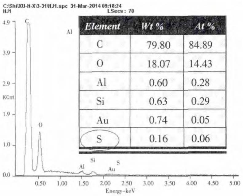 失效品為玻璃光管燈,內(nèi)部的LED燈帶使用單組份室溫固化硅橡膠粘結(jié)固定在玻璃管上,固膠部位燈帶上的 LED 燈珠出現(xiàn)發(fā)黃變暗現(xiàn)象。失效燈珠封裝膠的材質(zhì)為硅橡膠使用SEM&EDS測(cè)試封裝膠的元素成分,發(fā)現(xiàn)其比正常燈珠封裝膠成分多檢出了硫(S)元素,測(cè)試結(jié)果如圖 4 所示。